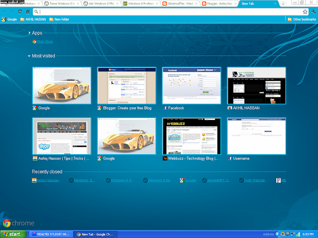 There has been lot of news about Windows 8 and we have seen couple of leaks as well. The folks are busy creating wallpapers, themes and many other graphical stuffs for Windows 8. Our friends at Compixels has found a Windows 8 based theme for Google Chrome. The theme uses the Windows 8 Betta fish wallpaper giving a bluish look to the browser. Here is how the browser looks with Windows 8 theme-